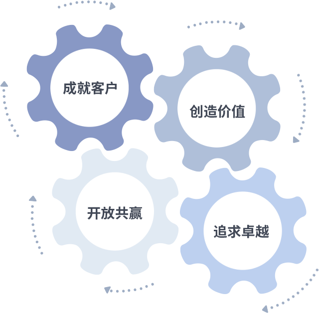 成就客戶是一切決策的出發點,創造價值是衡量所有工作的標準,追求卓越是我們做事做人的態度,開放共贏是我們的格局也是最終的結果。價值觀的齒輪環環相扣,推動著組織里的每個人不斷向前。